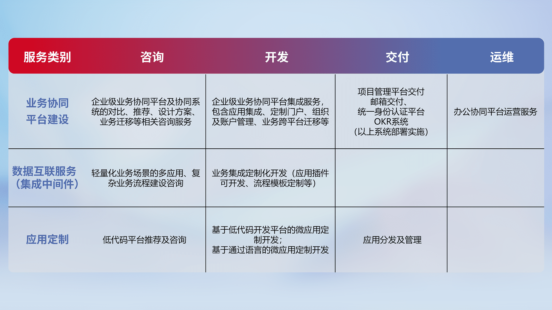 针对钉钉、、企微、、IDaas等平台级产品提供产品的规划、、、、方案、、交付、、、定制化开发等服务,,,,实现如统一协同办公、、、智能客户服务、、、混合会议管理、、、、智能数据查询、、、等业务场景,,实现数字化转型。。。